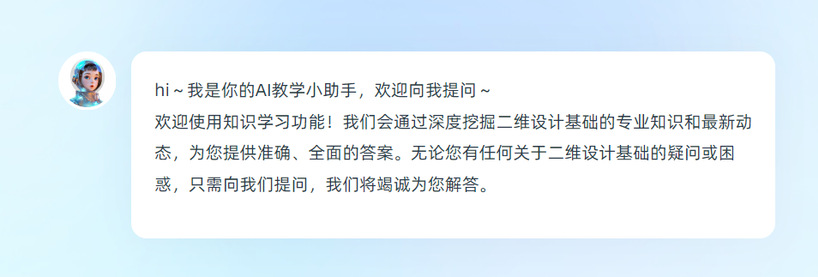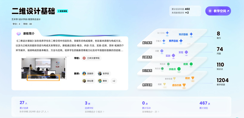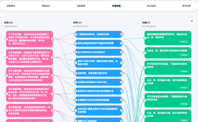 “二维设计基础”为教育部首批国家级一流本科课程。此次课程知识图谱的建设,在原有线下课程的基础上,借助知识图谱,进行了结构化的教学改革,通过展示知识之间的关联和层次关系,帮助学生更好地理解和掌握课程内容,提高学习效率。同时,为学生提供了丰富多样的教学资源,如视频教程、作业案例、AI问答等,方便学生随时随地学习,掌握自己的学习进度和薄弱环节,及时调整学习策略,从而制定个性化的学习计划。同时,数智化平台可以实时记录学生的学习数据,为教师提供准确的评估依据,优化教学方案。这种可视化的课程学习过程不仅增加了学习的趣味性,还让学习路径变得清晰可见。该课程充分利用“人工智能+教育”的新模式,挖掘学习者的潜能,助力学生塑造自我、实现自我价值。